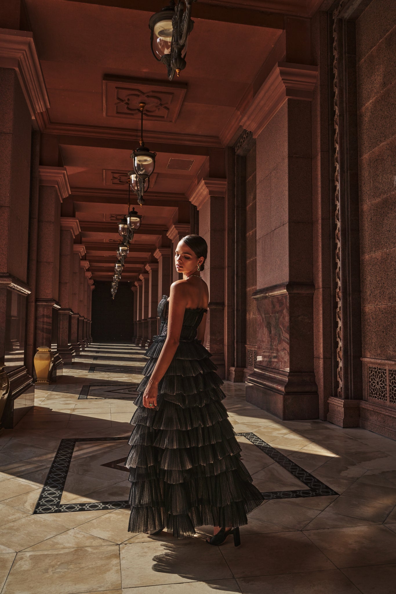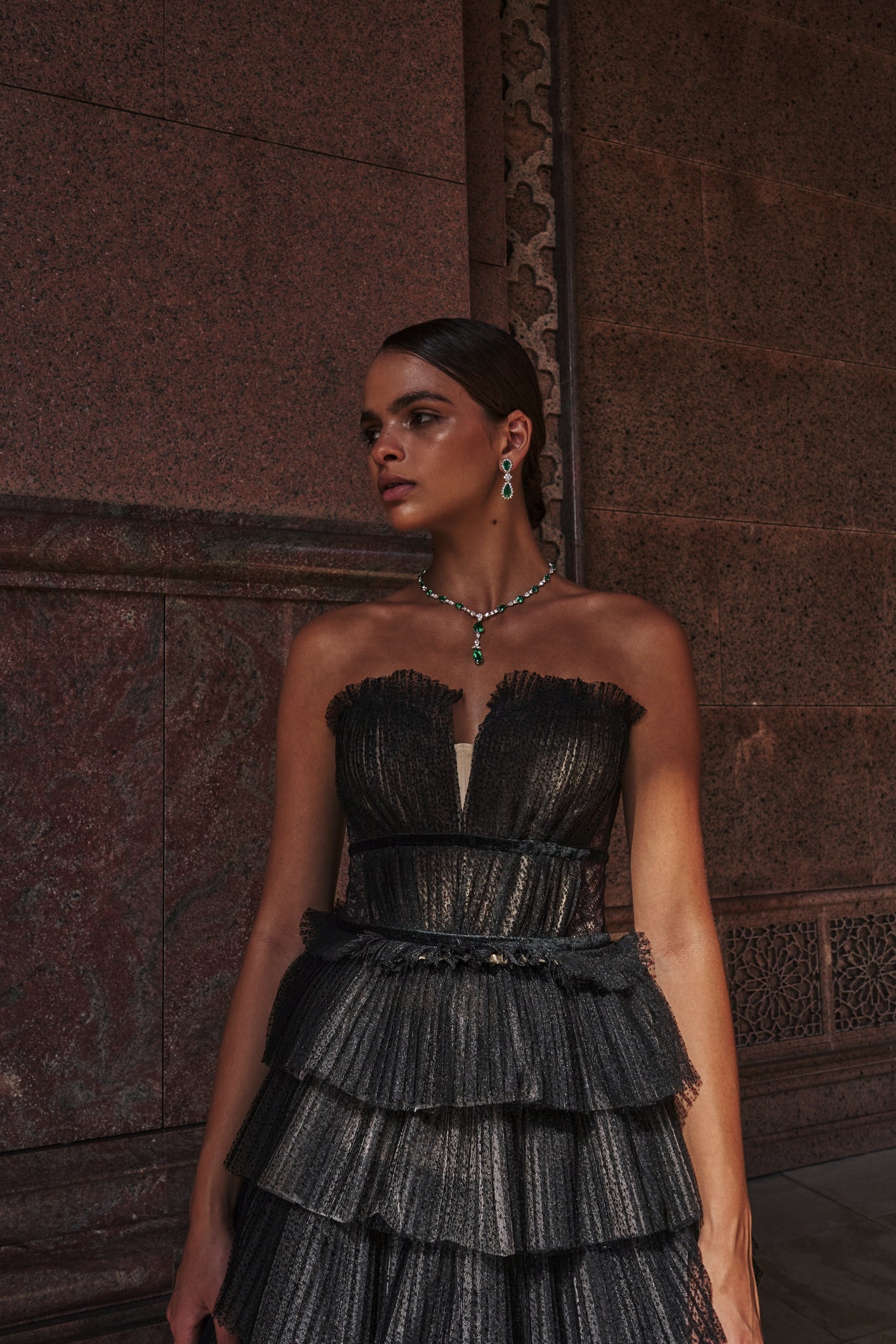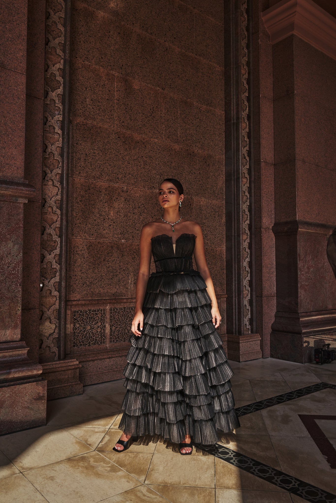 Crushed dotted block mesh long layered dress in a V-neck illusion cut.Read more