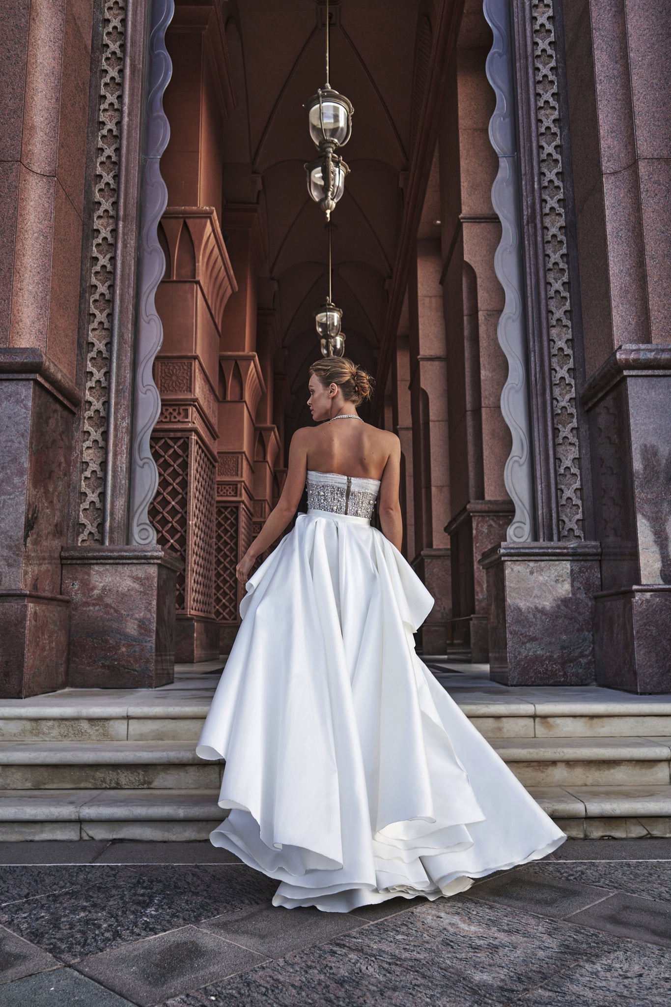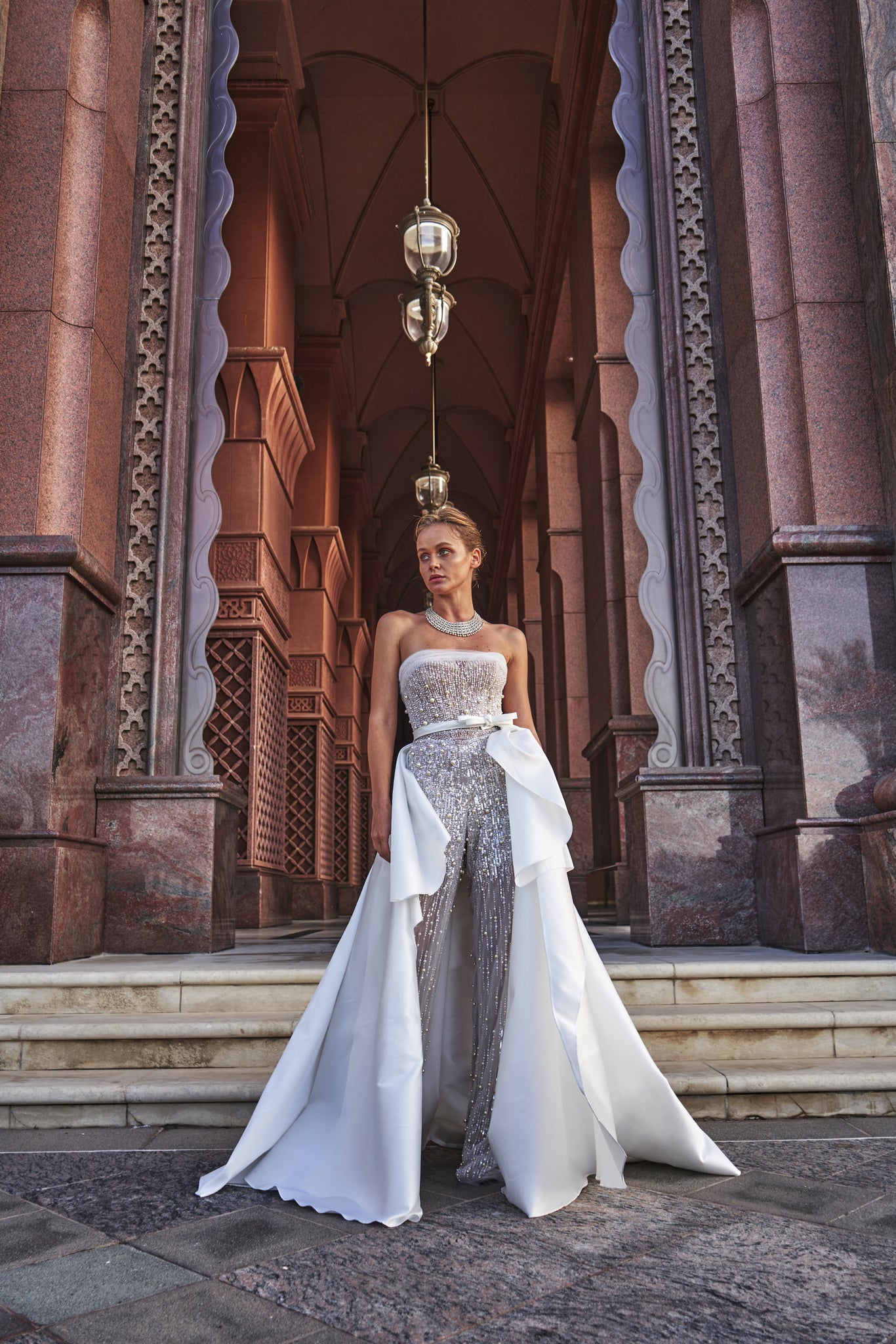 Layered tulle jumpsuit with all-over beaded pearls and sequins, styled up with a detachable white taffeta belted in ruffled train.