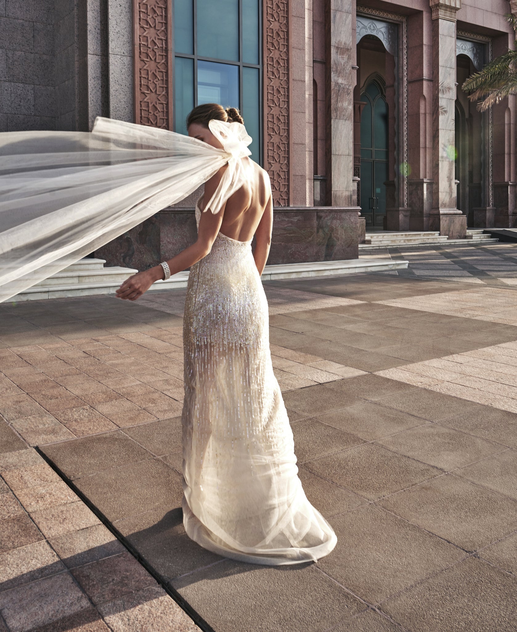 Tulle layered dress fully sequins in a turtleneck bodice with a long tulle bow on the neckline.Read more