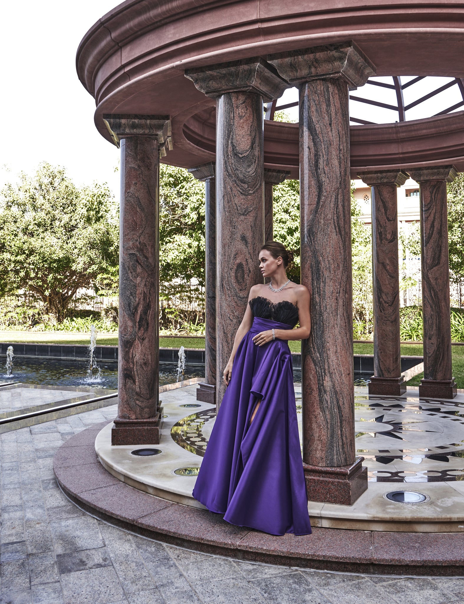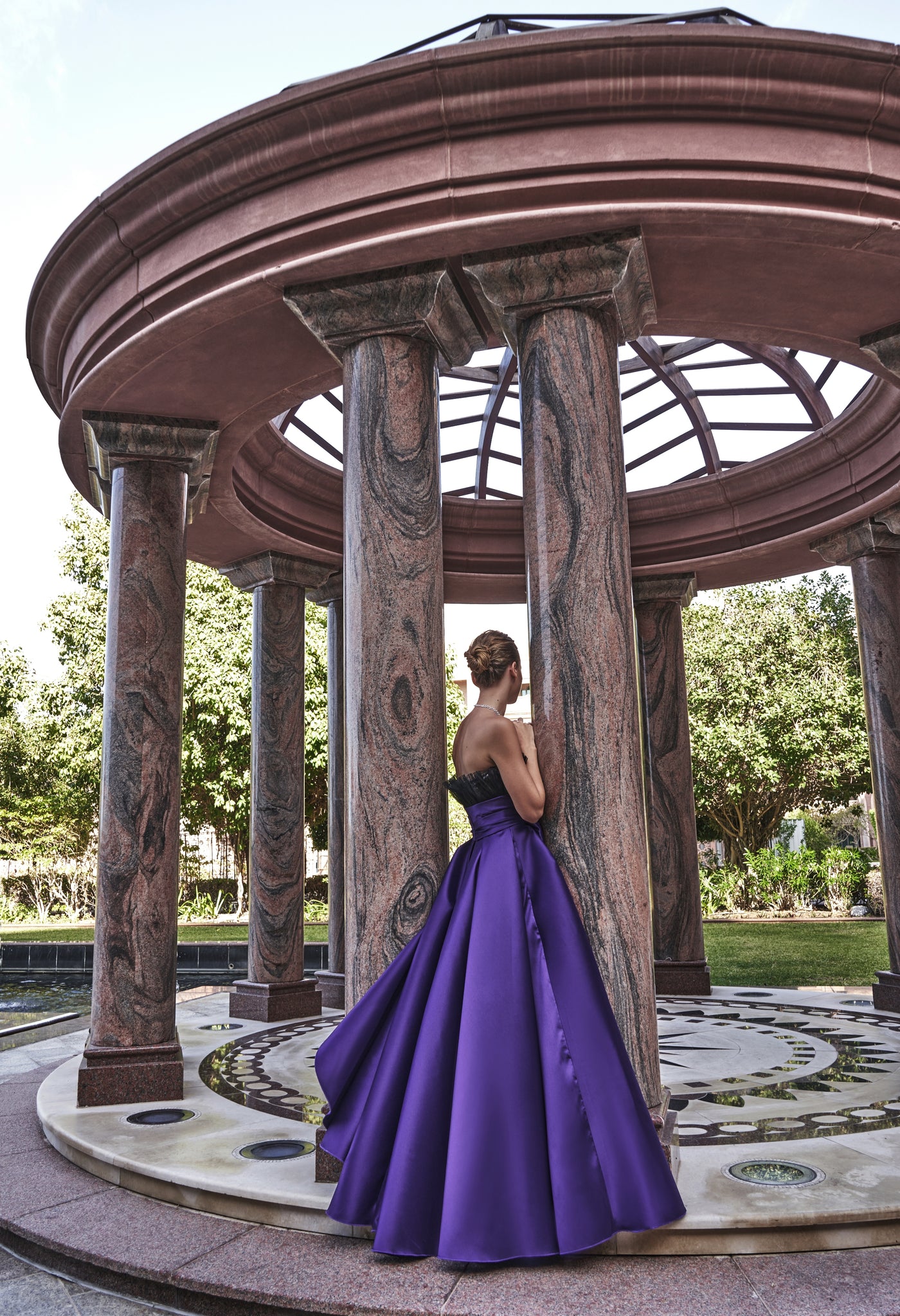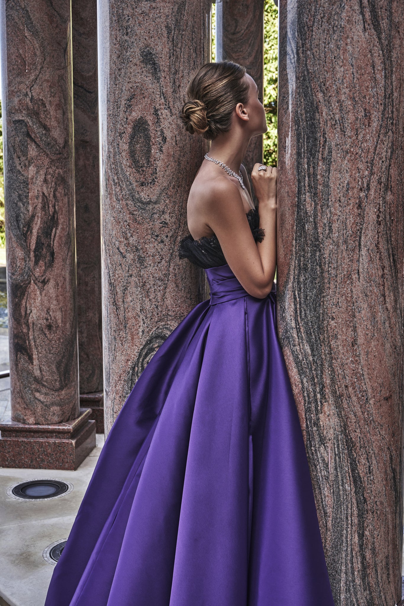 Purple taffeta pleated gown with a crushed dotted tulle bustier.Read more
